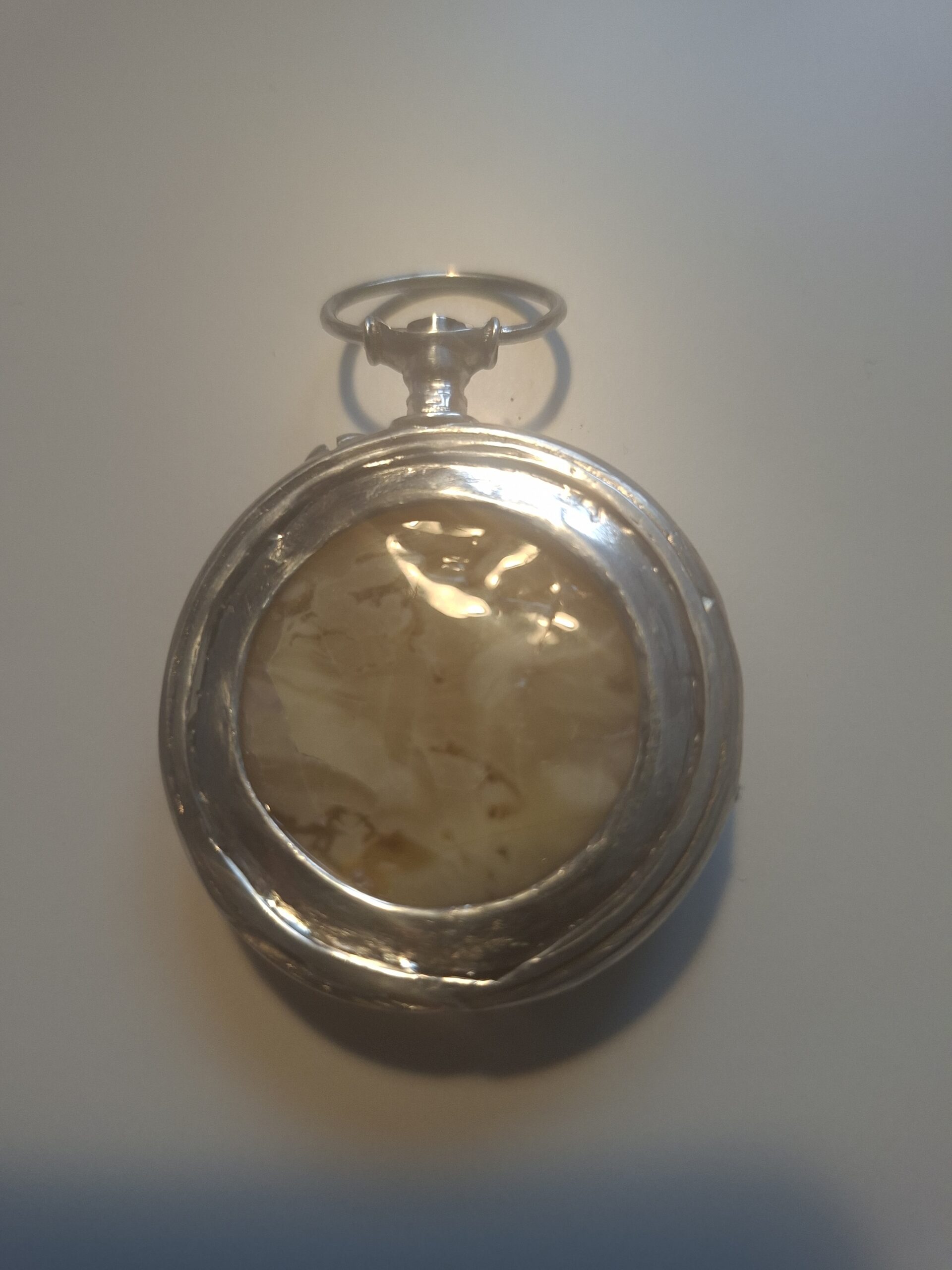 Bursztyn o nieprawdopodobnej barwie oprawiony w element starej koperty zegarka